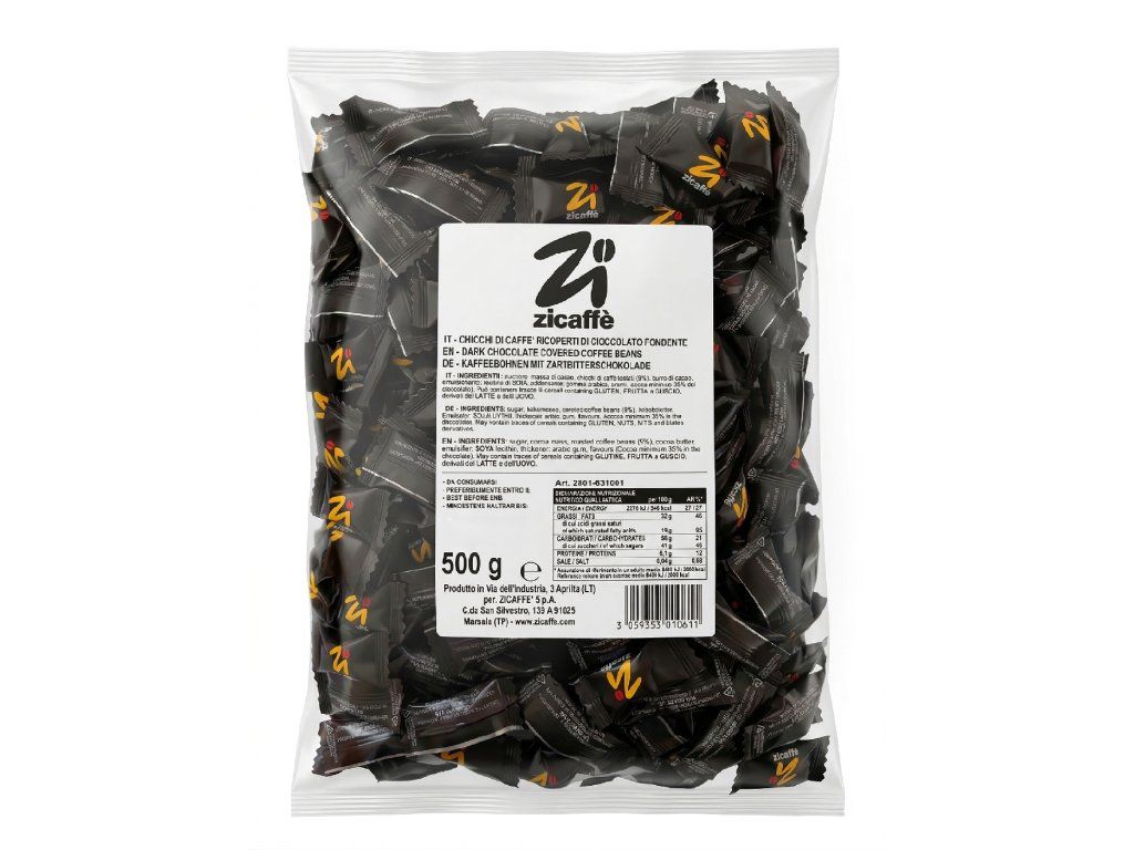 Комбинацията от хрупкави печени кафени зърна и висококачествен тъмен шоколад предлага перфектно вкусово изживяване и бърз тласък. Този премиум продукт от традиционната италианска марка Zicaffè е идеален като сладко допълнение към кафе, оригинален подарък или просто за бърз енергиен тласък и задоволяване на апетита ви за сладко.